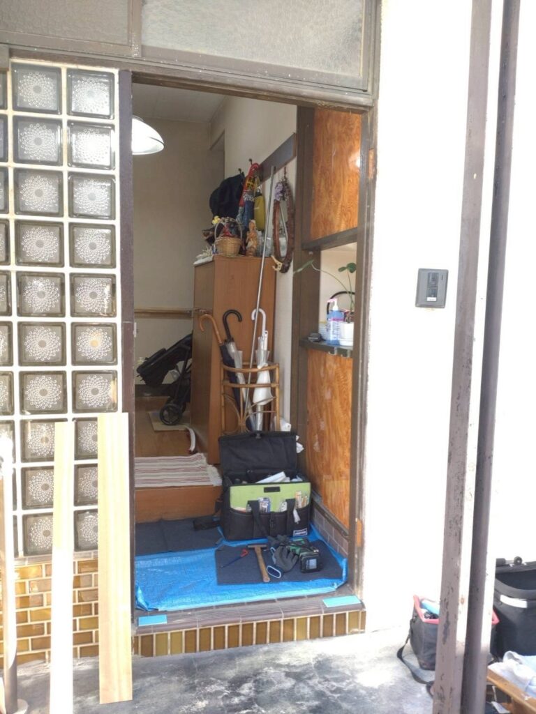 玄関入口内は養生をしています。