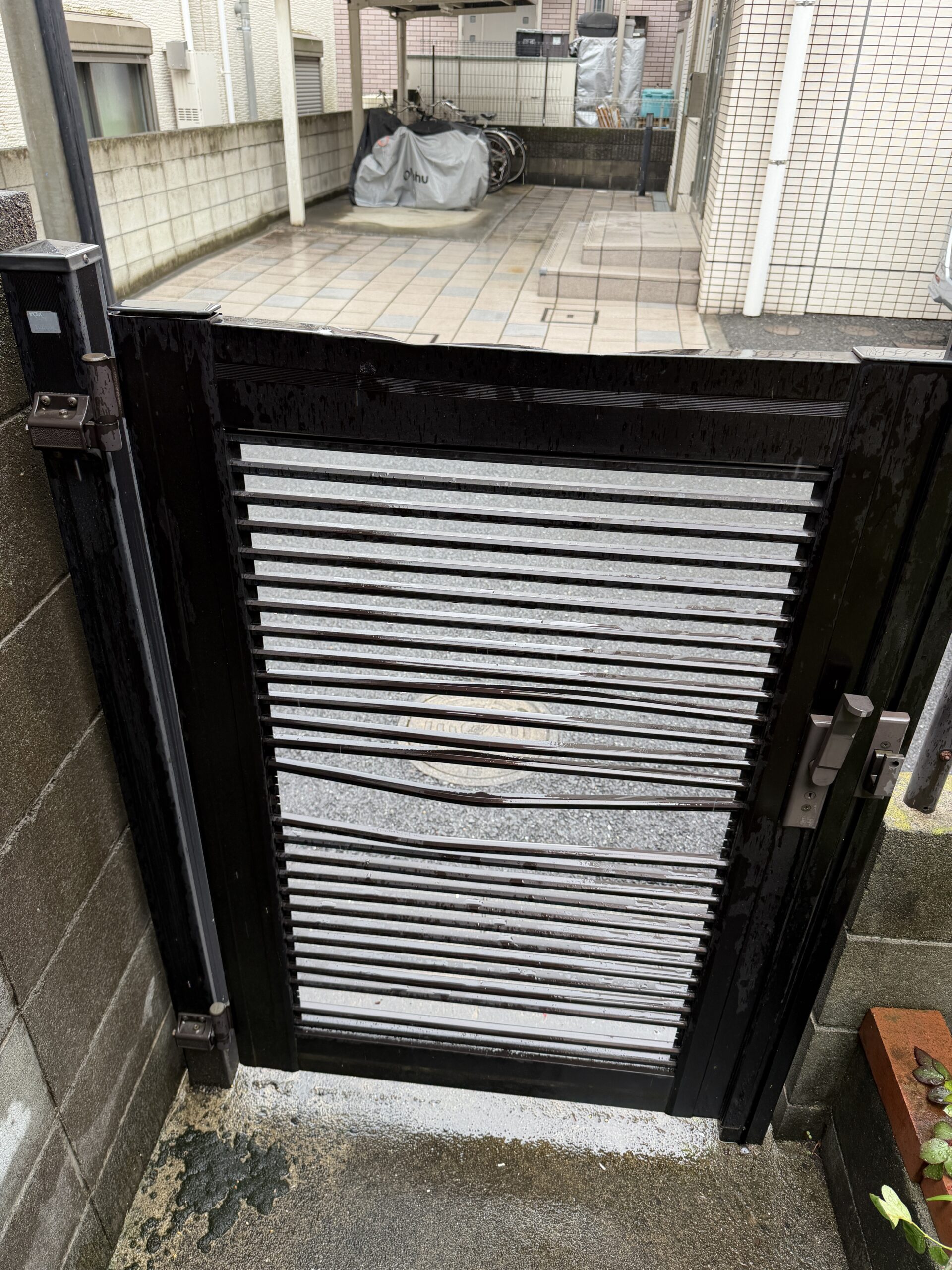 品川区荏原で、一部破損と経年で門扉の交換のため現地調査を行いました。